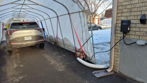 Bornes de recharge de niveau 2 de modèles divers tels que EV Duty, Flo, Tesla, TechnoVE, Grizzl-E, Siemens et Bosch avec raccordement permanent ou avec prise de courant NEMA 6-50R ou 14-50R. Installations avec contrôleur de charge dans le contexte d'un immeuble en copropriété divise.