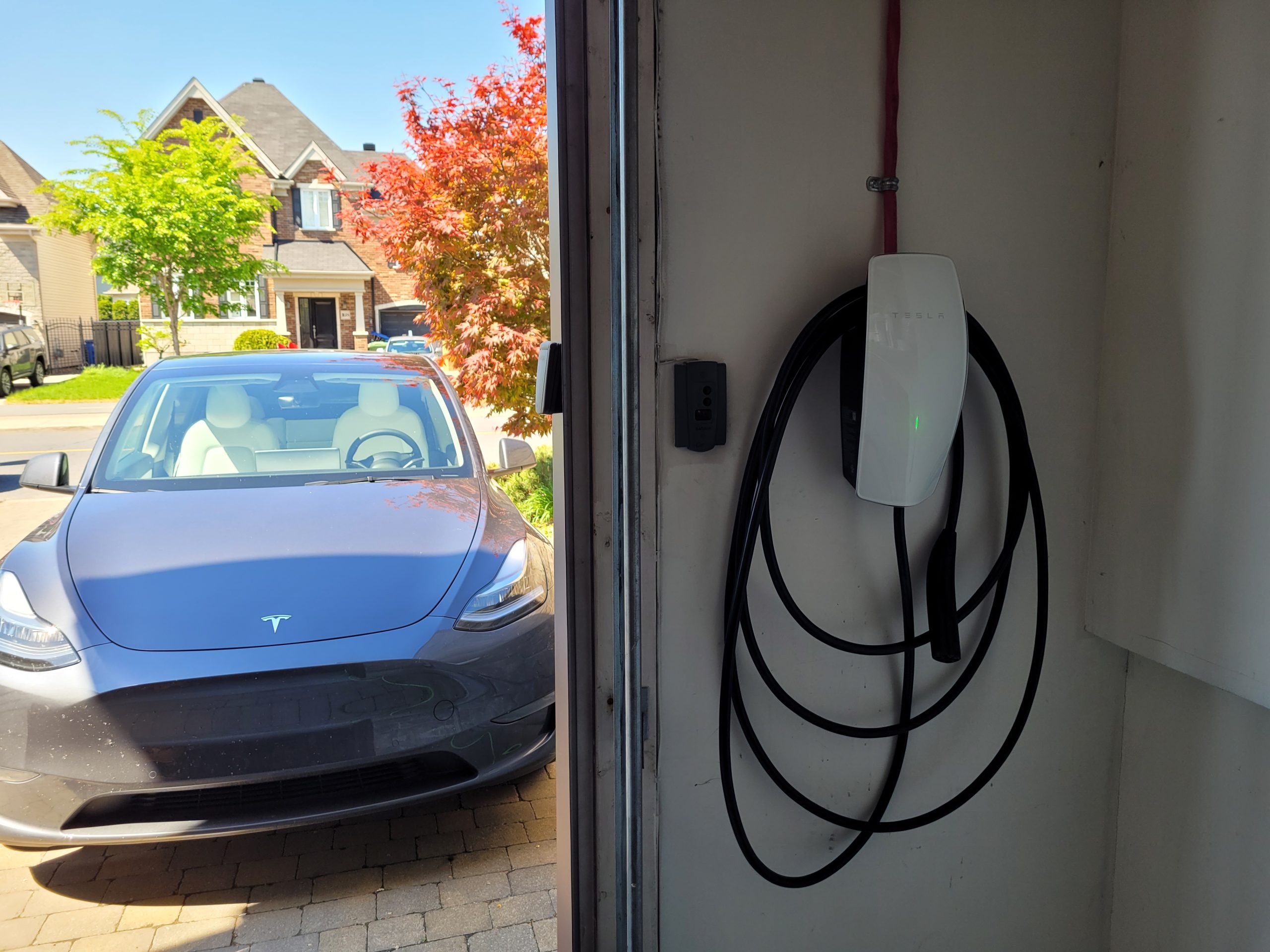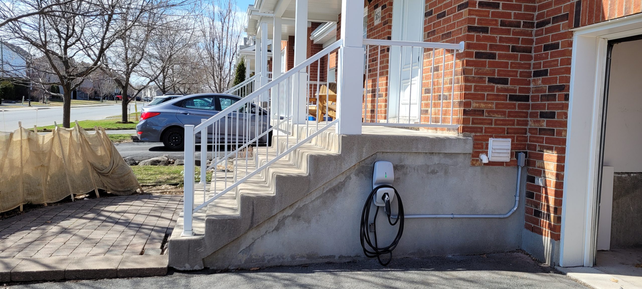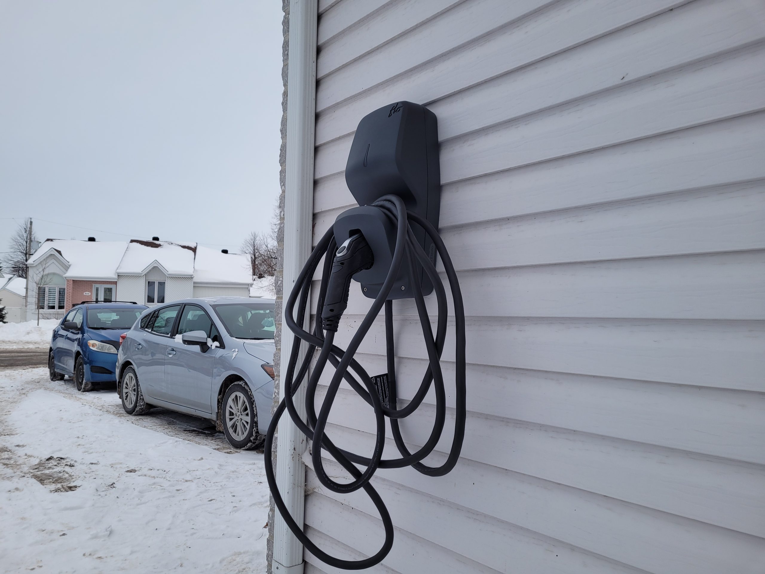 Bornes de recharge de niveau 2 de modèles divers tels que EV Duty, Flo, Tesla, TechnoVE, Grizzl-E, Siemens et Bosch avec raccordement permanent ou avec prise de courant NEMA 6-50R ou 14-50R. Installations avec contrôleur de charge dans le contexte d'un immeuble en copropriété divise.